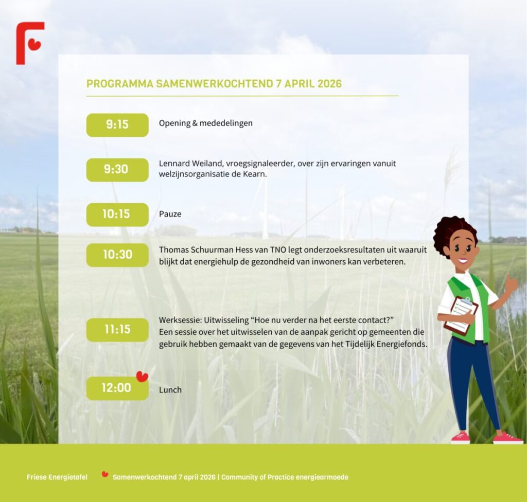 Vanuit die vraag organiseert de Friese Energietafel op 7 april 2026 een samenwerkochtend over de relatie tussen energie, bestaanszekerheid en gezondheid.